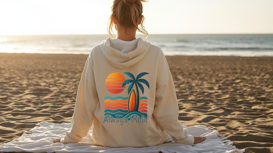 For the days when the sun clocks in before you do. This design is built for anyone who’d rather be parked on a beach blanket, watching the sky warm up, pretending their to‑do list doesn’t exist yet. Big sun, easy waves, a palm that’s seen some things — the essentials.